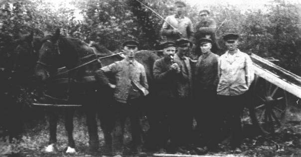 Im Herbst wurden die Kartoffeln mit dem Pferdewagen zum "Handdreiher" gebracht, um sortiert zu werden. "Mit Schweep up Nack" der Kutscher Heyo Wessels, neben ihm auf dem Wagen Hermann Krumminga. Unten von links: Klaas Griepenburg, Fligiel aus der Schmiede (er hieß bei allen "Fliegel"), Elso Classen aus Rajen, Bernhard Poppen, Flachsmeer, und Gerhard Luikenga, ebenfalls Rajen. |
